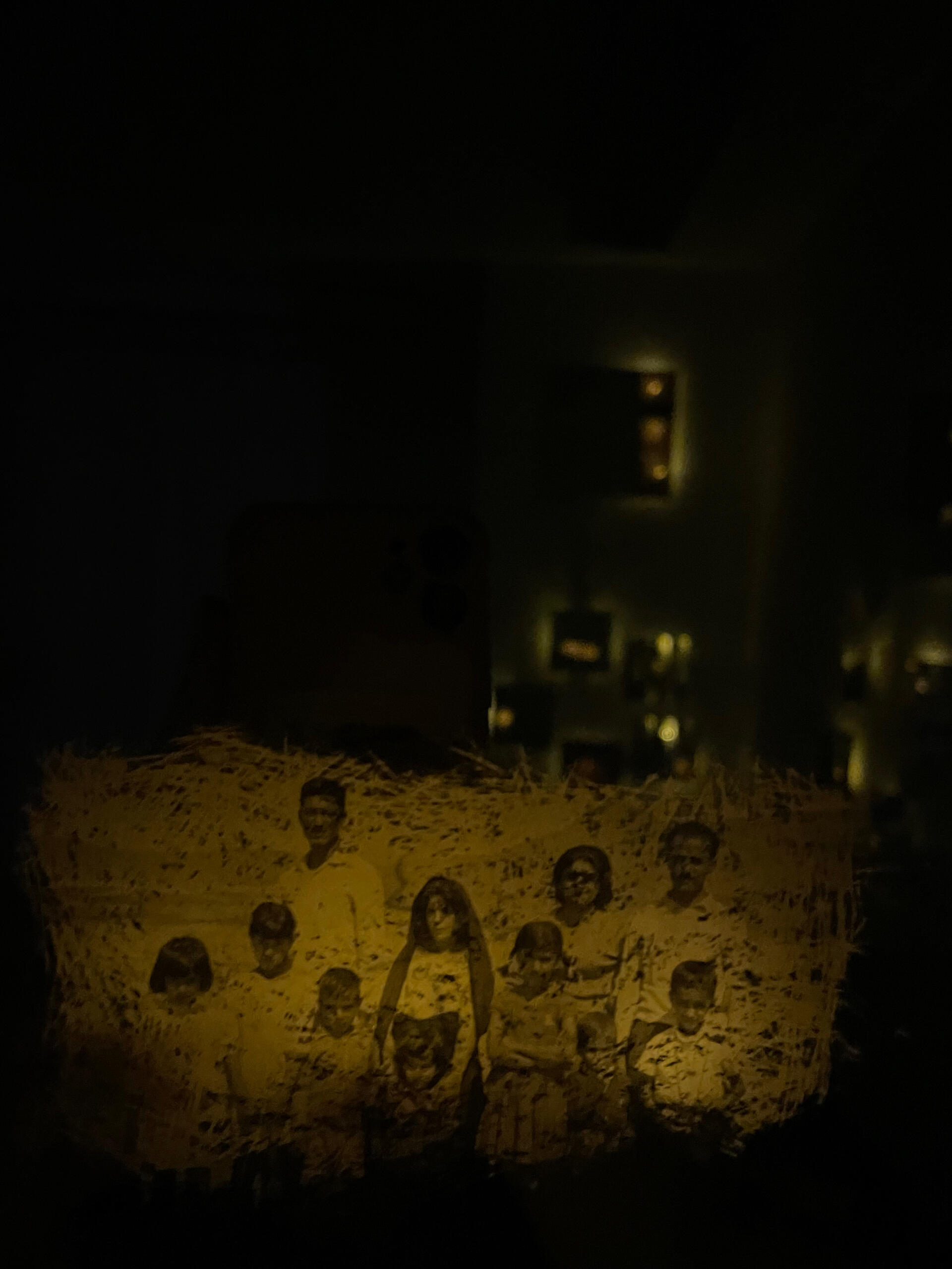 'Shores of the body' is a video installation made from the artist's childhood photos, projected onto the fictitious corner of the home where the artist was born, which is now defunct.