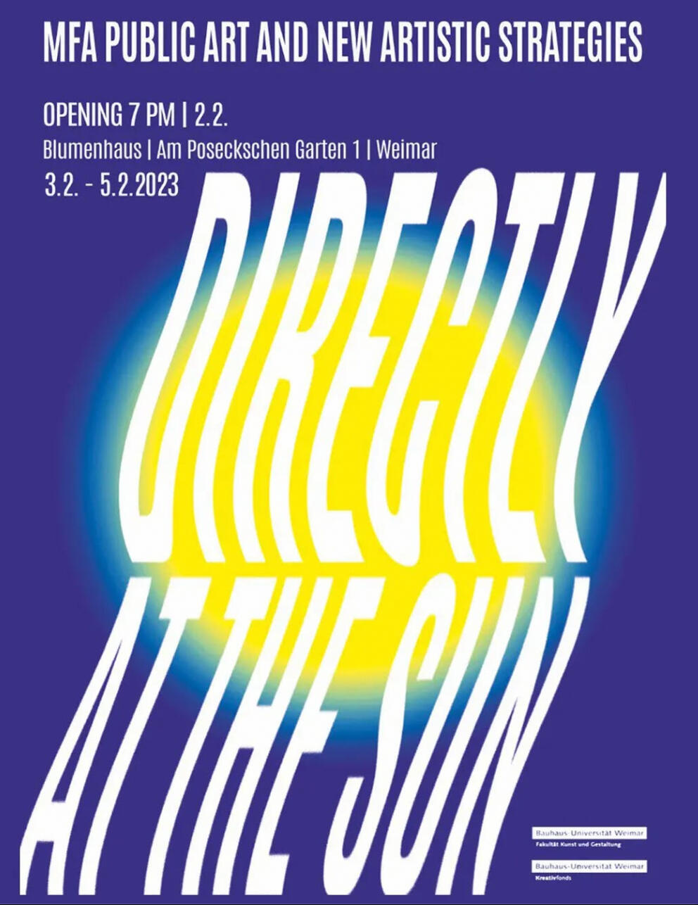 The exhibition showcases the works of the MFA programme "Public Art and New Artistic Strategies" of the Bauhaus-Universität Weimar. 'Directly at the sun' is organised by Vertr.- Prof. Ina Weise, Lea Maria Wittich, Arijit Bhattacharyya and Jirka Reichmann (Co-ordination). The exhibition is realised with the support of Kreativefonds.